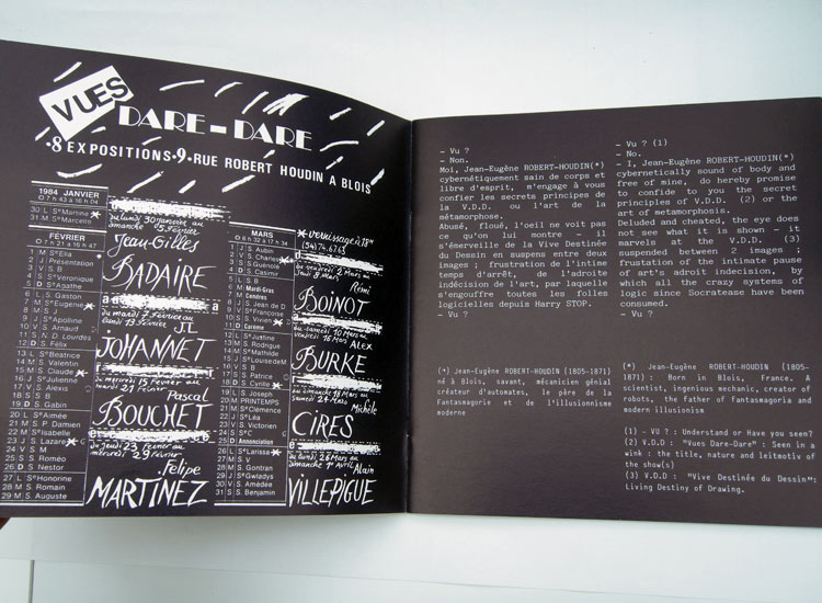 – Tirage Limité est né en 1982 autour de l’idée du reportage photographique, par l’artiste lui-même, de son lieu de travail : cet intime œuvrement où le temps s’emploie. (Tours – Biennale de Paris – Vendôme).- Tard dans la nuit du 2 novembre 1983, Rémi Boinot réalise avec le photographe Felipe Martinez, de grandes empreintes de la rue Robert-Houdin sur de la toile sensible.- RÉVÉLATEUR – Vues Dare-Dare venait de naître, fondé sur la rapidité des expositions à l’image des vidéo-clips.Le lieu : l’ancienne boutique du photographe, où afficher les huit sensibilités à vitesse hebdomadaire a conduit le public à la clairvoyance d’une surexposition.